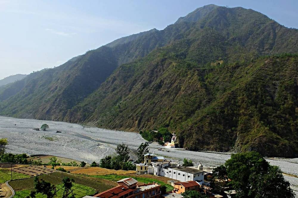 El ashram de Babaji y el Monte Kailash, donde Babaji apareció en 1970 en una cueva junto a los edificios que se ven al otro lado del río.