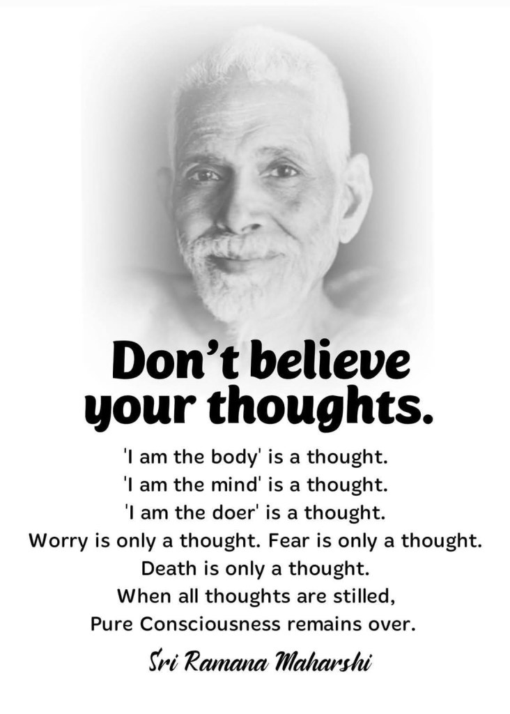 “Don’t believe your thoughts. ‘I am the body’ is a thought. ‘I am the mind’ is a thought. ‘I am the doer’ is a thought. Worry is only a thought. Fear is only a thought. Death is only a thought.